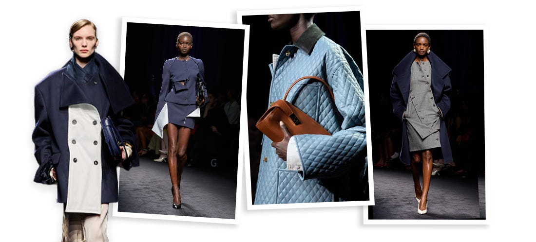 Já a Ferragamo sob gestão criativa de Maximilian Davis usou o rigor dos uniformes oficiais da marinha para levar para seu desfile peças que carregavam o movimento do mar. No lugar de vestirem o corpo de maneira estática, possuíam palas soltas e abotoamentos desencontrados dos eixos x e y justamente para revelarem fendas e decotes e proporcionarem uma fluidez que normalmente não encontramos nesse tipo de construção rigorosa.